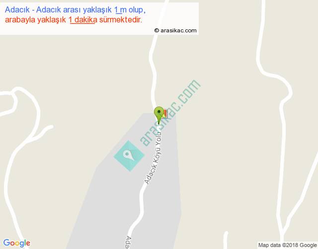 Adacık - Adacık arası yaklaşık olarak 90 km/h ile yukarıda belirtilen sürede olup, iki yerin kuş uçuşu uzaklığı (mesafesi) 0'dir. Yolculuk otobüsle 1 dakika sürmektedir.