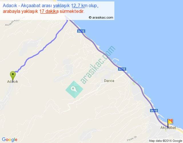 Adacık - Akçaabat arası yaklaşık olarak 90 km/h ile yukarıda belirtilen sürede olup, iki yerin kuş uçuşu uzaklığı (mesafesi) 8'dir. Yolculuk otobüsle 22 dakika sürmektedir.