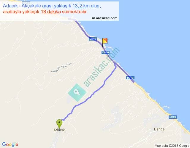 Adacık - Akçakale arası yaklaşık olarak 90 km/h ile yukarıda belirtilen sürede olup, iki yerin kuş uçuşu uzaklığı (mesafesi) 5'dir. Yolculuk otobüsle 23 dakika sürmektedir.