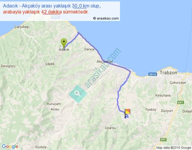 Adacık - Akçaköy arası yaklaşık olarak 90 km/h ile yukarıda belirtilen sürede olup, iki yerin kuş uçuşu uzaklığı (mesafesi) 18'dir. Yolculuk otobüsle 54 dakika sürmektedir.