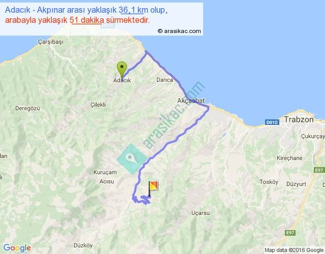 Adacık - Akpınar arası yaklaşık olarak 90 km/h ile yukarıda belirtilen sürede olup, iki yerin kuş uçuşu uzaklığı (mesafesi) 14'dir. Yolculuk otobüsle 1 saat 6 dakika sürmektedir.