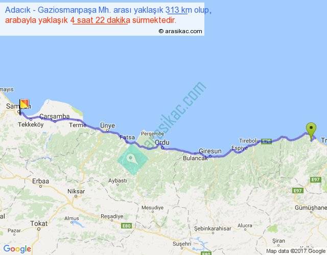 Adacık - Gaziosmanpaşa Mh. arası yaklaşık olarak 90 km/h ile yukarıda belirtilen sürede olup, iki yerin kuş uçuşu uzaklığı (mesafesi) 261'dir. Eğer belirtilen yerler arasında uçak seferi var ise bu süre uçakla 24 dakika'ya kadar düşebilir. Yolculuk otobüsle 5 saat 40 dakika sürmektedir.