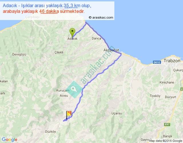 Adacık - Işıklar arası yaklaşık olarak 90 km/h ile yukarıda belirtilen sürede olup, iki yerin kuş uçuşu uzaklığı (mesafesi) 16'dir. Yolculuk otobüsle 59 dakika sürmektedir.