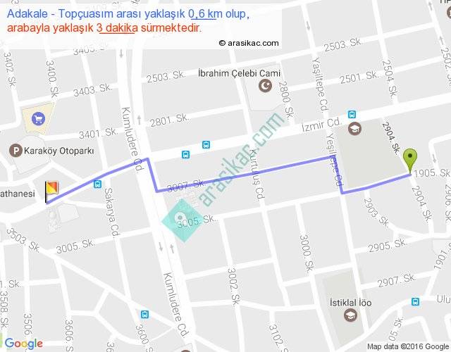 Adakale - Topçuasım arası yaklaşık olarak 90 km/h ile yukarıda belirtilen sürede olup, iki yerin kuş uçuşu uzaklığı (mesafesi) 0'dir. Yolculuk otobüsle 3 dakika sürmektedir.