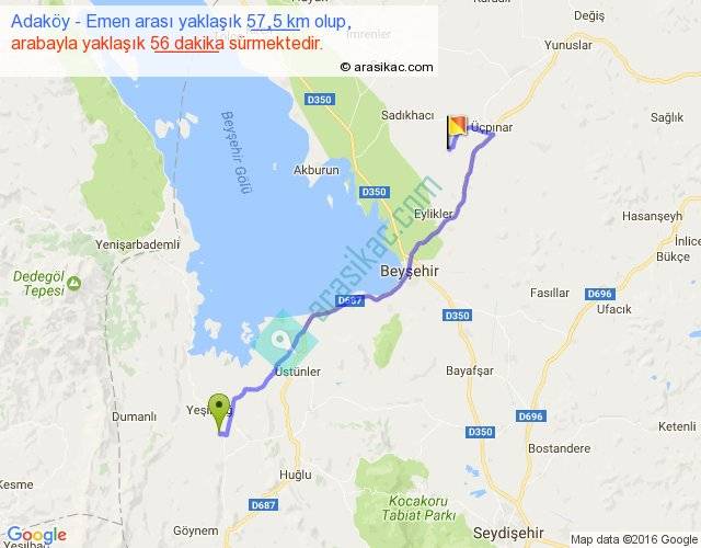 Adaköy - Emen arası yaklaşık olarak 90 km/h ile yukarıda belirtilen sürede olup, iki yerin kuş uçuşu uzaklığı (mesafesi) 40'dir. Yolculuk otobüsle 1 saat 12 dakika sürmektedir.