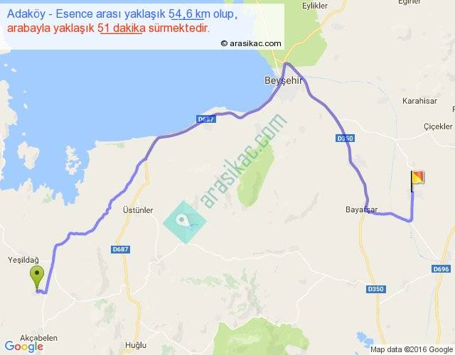 Adaköy - Esence arası yaklaşık olarak 90 km/h ile yukarıda belirtilen sürede olup, iki yerin kuş uçuşu uzaklığı (mesafesi) 33'dir. Yolculuk otobüsle 1 saat 6 dakika sürmektedir.