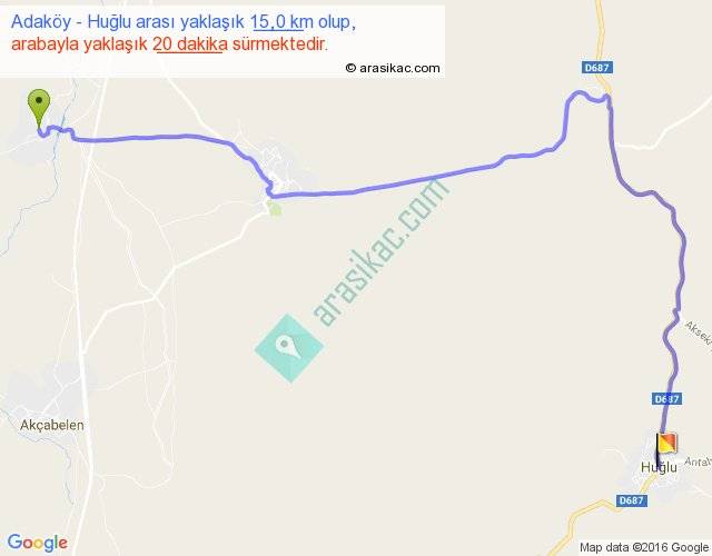 Adaköy - Huğlu arası yaklaşık olarak 90 km/h ile yukarıda belirtilen sürede olup, iki yerin kuş uçuşu uzaklığı (mesafesi) 10'dir. Yolculuk otobüsle 26 dakika sürmektedir.
