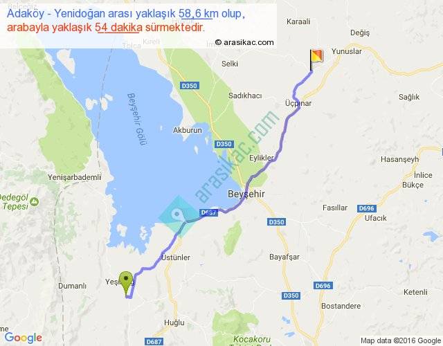 Adaköy - Yenidoğan arası yaklaşık olarak 90 km/h ile yukarıda belirtilen sürede olup, iki yerin kuş uçuşu uzaklığı (mesafesi) 51'dir. Yolculuk otobüsle 1 saat 10 dakika sürmektedir.