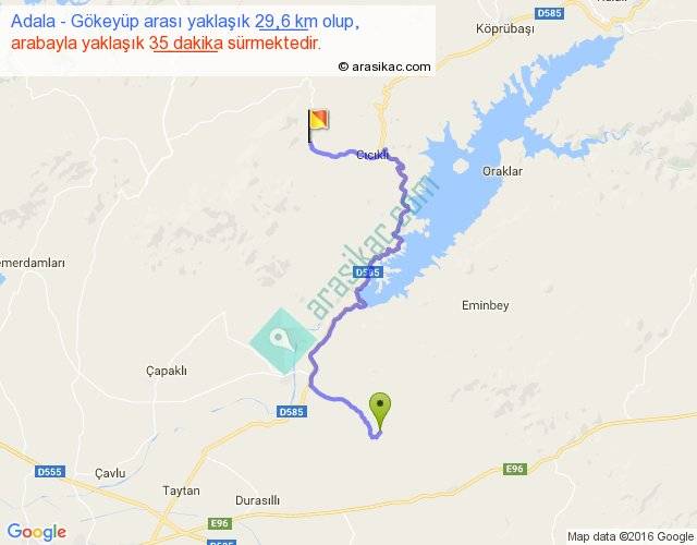 Adala - Gökeyüp arası yaklaşık olarak 90 km/h ile yukarıda belirtilen sürede olup, iki yerin kuş uçuşu uzaklığı (mesafesi) 16'dir. Yolculuk otobüsle 45 dakika sürmektedir.