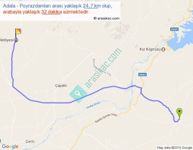 Adala - Poyrazdamları arası yaklaşık olarak 90 km/h ile yukarıda belirtilen sürede olup, iki yerin kuş uçuşu uzaklığı (mesafesi) 18'dir. Yolculuk otobüsle 41 dakika sürmektedir.
