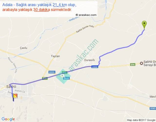 Adala - Sağlık arası yaklaşık olarak 90 km/h ile yukarıda belirtilen sürede olup, iki yerin kuş uçuşu uzaklığı (mesafesi) 18'dir. Yolculuk otobüsle 39 dakika sürmektedir.