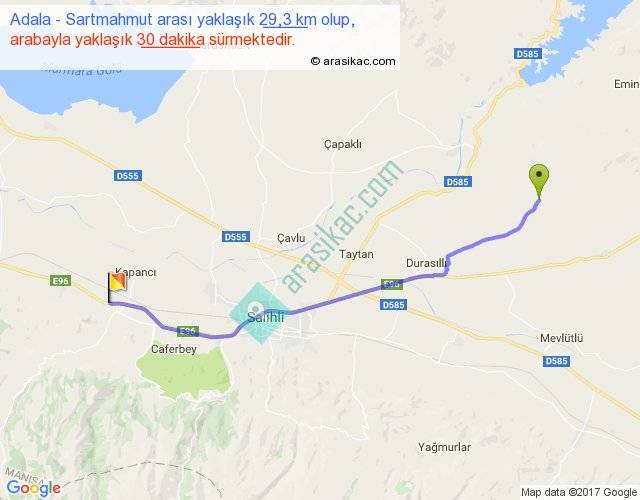 Adala - Sartmahmut arası yaklaşık olarak 90 km/h ile yukarıda belirtilen sürede olup, iki yerin kuş uçuşu uzaklığı (mesafesi) 26'dir. Yolculuk otobüsle 39 dakika sürmektedir.