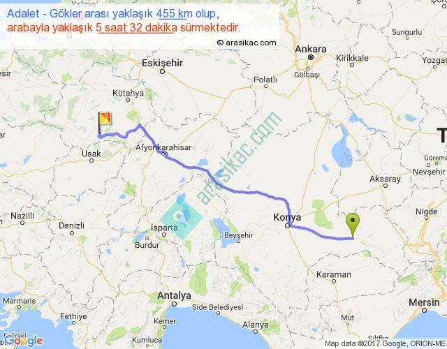 Adalet - Gökler arası yaklaşık olarak 90 km/h ile yukarıda belirtilen sürede olup, iki yerin kuş uçuşu uzaklığı (mesafesi) 373'dir. Eğer belirtilen yerler arasında uçak seferi var ise bu süre uçakla 34 dakika'ya kadar düşebilir. Yolculuk otobüsle 7 saat 11 dakika sürmektedir.