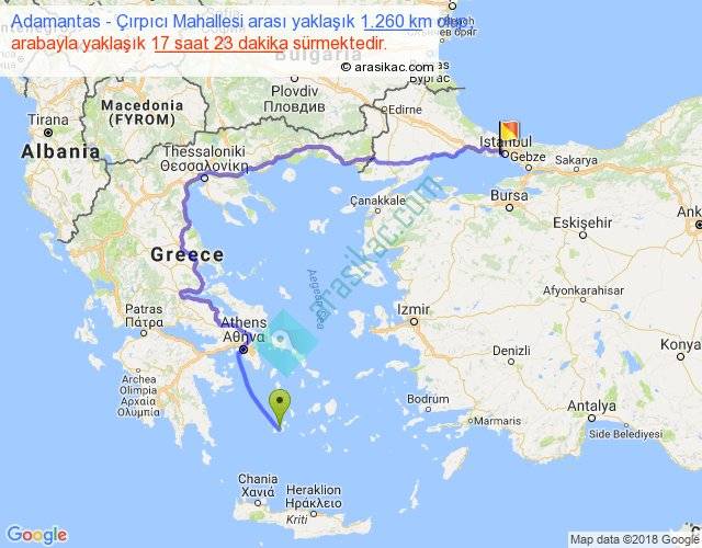 Adamantas - Çırpıcı Mahallesi arası yaklaşık olarak 90 km/h ile yukarıda belirtilen sürede olup, iki yerin kuş uçuşu uzaklığı (mesafesi) 608'dir. Eğer belirtilen yerler arasında uçak seferi var ise bu süre uçakla 56 dakika'ya kadar düşebilir. Yolculuk otobüsle 22 saat 35 dakika sürmektedir.