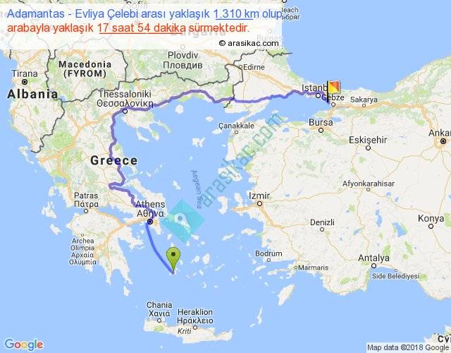 Adamantas - Evliya Çelebi arası yaklaşık olarak 90 km/h ile yukarıda belirtilen sürede olup, iki yerin kuş uçuşu uzaklığı (mesafesi) 617'dir. Eğer belirtilen yerler arasında uçak seferi var ise bu süre uçakla 56 dakika'ya kadar düşebilir. Yolculuk otobüsle 23 saat 16 dakika sürmektedir.