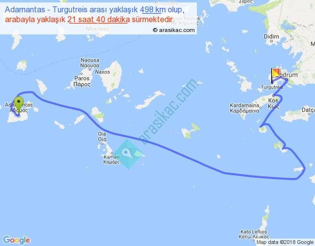 Adamantas - Turgutreis arası yaklaşık olarak 90 km/h ile yukarıda belirtilen sürede olup, iki yerin kuş uçuşu uzaklığı (mesafesi) 252'dir. Eğer belirtilen yerler arasında uçak seferi var ise bu süre uçakla 23 dakika'ya kadar düşebilir. Yolculuk otobüsle 1 gün 4 saat sürmektedir.
