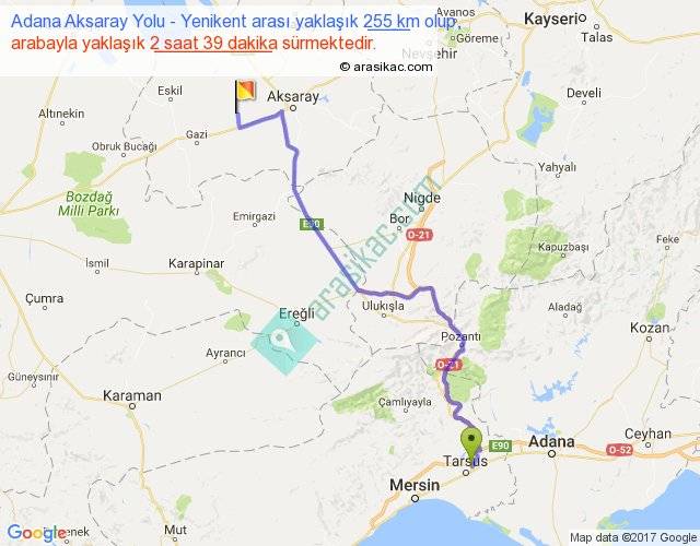 Adana Aksaray Yolu - Yenikent arası yaklaşık olarak 90 km/h ile yukarıda belirtilen sürede olup, iki yerin kuş uçuşu uzaklığı (mesafesi) 186'dir. Yolculuk otobüsle 3 saat 26 dakika sürmektedir.