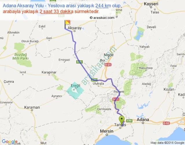 Adana Aksaray Yolu - Yesilova arası yaklaşık olarak 90 km/h ile yukarıda belirtilen sürede olup, iki yerin kuş uçuşu uzaklığı (mesafesi) 187'dir. Yolculuk otobüsle 3 saat 18 dakika sürmektedir.