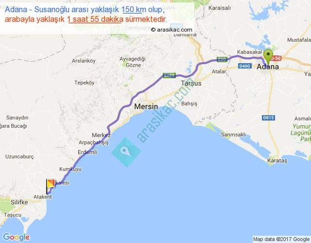Adana - Susanoğlu arası yaklaşık olarak 90 km/h ile yukarıda belirtilen sürede olup, iki yerin kuş uçuşu uzaklığı (mesafesi) 128'dir. Yolculuk otobüsle 2 saat 29 dakika sürmektedir.