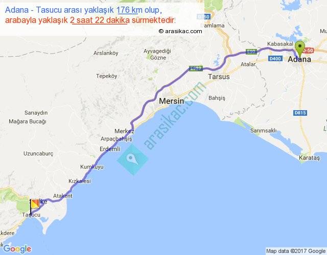 Adana - Tasucu arası yaklaşık olarak 90 km/h ile yukarıda belirtilen sürede olup, iki yerin kuş uçuşu uzaklığı (mesafesi) 148'dir. Yolculuk otobüsle 3 saat 4 dakika sürmektedir.