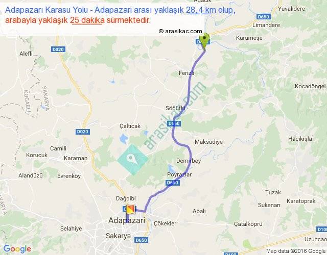 Adapazarı Karasu Yolu - Adapazari arası yaklaşık olarak 90 km/h ile yukarıda belirtilen sürede olup, iki yerin kuş uçuşu uzaklığı (mesafesi) 21'dir. Yolculuk otobüsle 32 dakika sürmektedir.