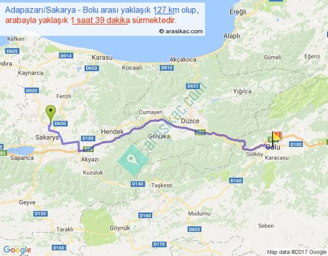 Adapazarı Sakarya - Bolu arası yaklaşık olarak 90 km/h ile yukarıda belirtilen sürede olup, iki yerin kuş uçuşu uzaklığı (mesafesi) 100'dir. Yolculuk otobüsle 2 saat 8 dakika sürmektedir.
