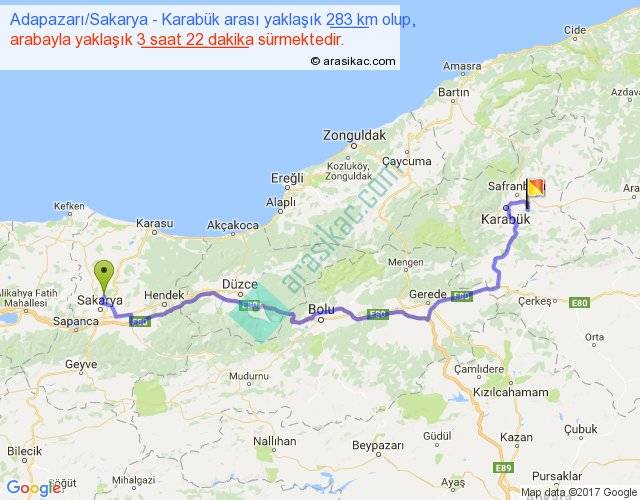 Adapazarı Sakarya - Karabük arası yaklaşık olarak 90 km/h ile yukarıda belirtilen sürede olup, iki yerin kuş uçuşu uzaklığı (mesafesi) 198'dir. Yolculuk otobüsle 4 saat 22 dakika sürmektedir.