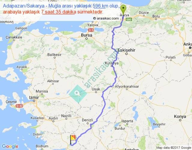 Adapazarı Sakarya - Muğla arası yaklaşık olarak 90 km/h ile yukarıda belirtilen sürede olup, iki yerin kuş uçuşu uzaklığı (mesafesi) 436'dir. Eğer belirtilen yerler arasında uçak seferi var ise bu süre uçakla 40 dakika'ya kadar düşebilir. Yolculuk otobüsle 9 saat 51 dakika sürmektedir.