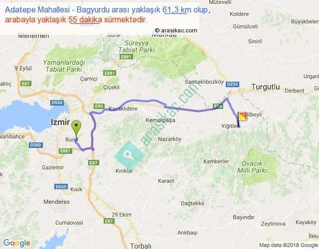 Adatepe Mahallesi - Bagyurdu arası yaklaşık olarak 90 km/h ile yukarıda belirtilen sürede olup, iki yerin kuş uçuşu uzaklığı (mesafesi) 39'dir. Yolculuk otobüsle 1 saat 11 dakika sürmektedir.