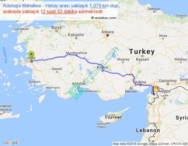 Adatepe Mahallesi - Hatay arası yaklaşık olarak 90 km/h ile yukarıda belirtilen sürede olup, iki yerin kuş uçuşu uzaklığı (mesafesi) 834'dir. Eğer belirtilen yerler arasında uçak seferi var ise bu süre uçakla 1 saat 16 dakika'ya kadar düşebilir. Yolculuk otobüsle 16 saat 44 dakika sürmektedir.