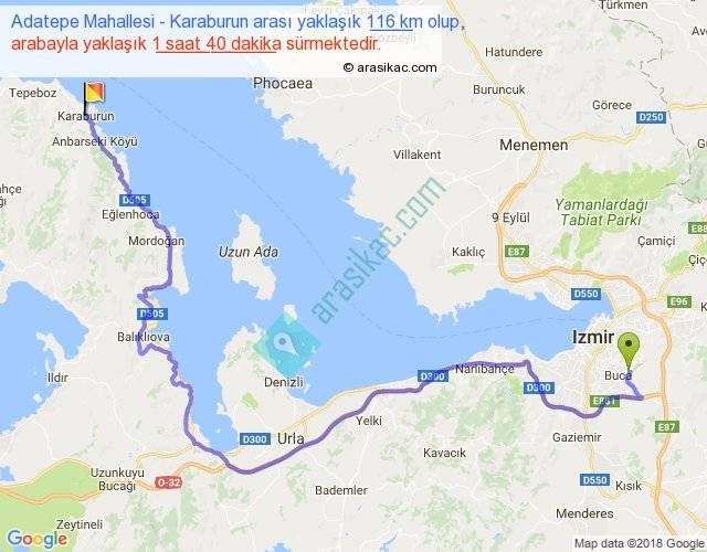 Adatepe Mahallesi - Karaburun arası yaklaşık olarak 90 km/h ile yukarıda belirtilen sürede olup, iki yerin kuş uçuşu uzaklığı (mesafesi) 65'dir. Yolculuk otobüsle 2 saat 10 dakika sürmektedir.