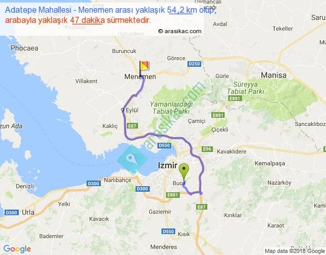 Adatepe Mahallesi - Menemen arası yaklaşık olarak 90 km/h ile yukarıda belirtilen sürede olup, iki yerin kuş uçuşu uzaklığı (mesafesi) 26'dir. Yolculuk otobüsle 1 saat 1 dakika sürmektedir.