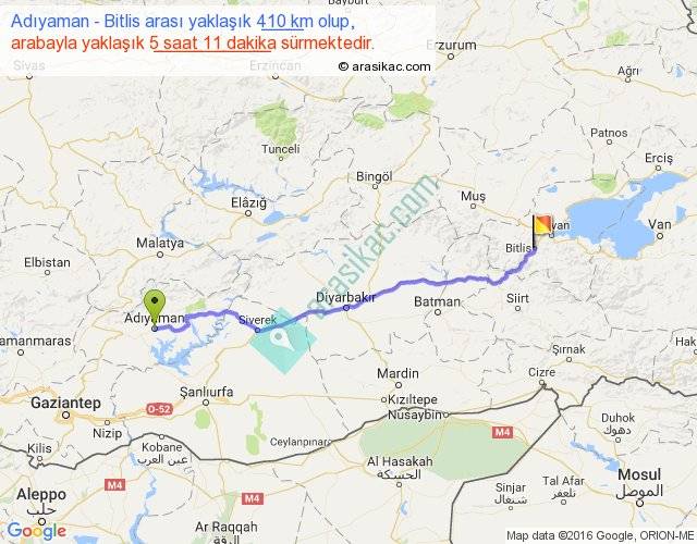 Adıyaman - Bitlis arası yaklaşık olarak 90 km/h ile yukarıda belirtilen sürede olup, iki yerin kuş uçuşu uzaklığı (mesafesi) 341'dir. Eğer belirtilen yerler arasında uçak seferi var ise bu süre uçakla 31 dakika'ya kadar düşebilir. Yolculuk otobüsle 6 saat 44 dakika sürmektedir.