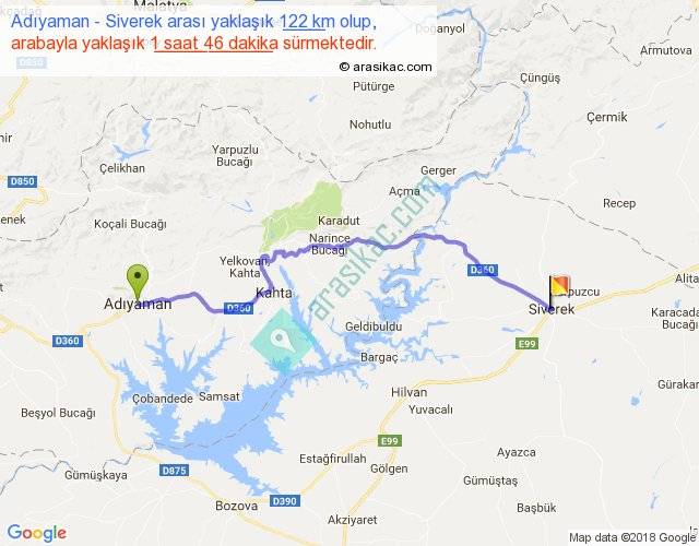Adıyaman - Siverek arası yaklaşık olarak 90 km/h ile yukarıda belirtilen sürede olup, iki yerin kuş uçuşu uzaklığı (mesafesi) 91'dir. Yolculuk otobüsle 2 saat 7 dakika sürmektedir.