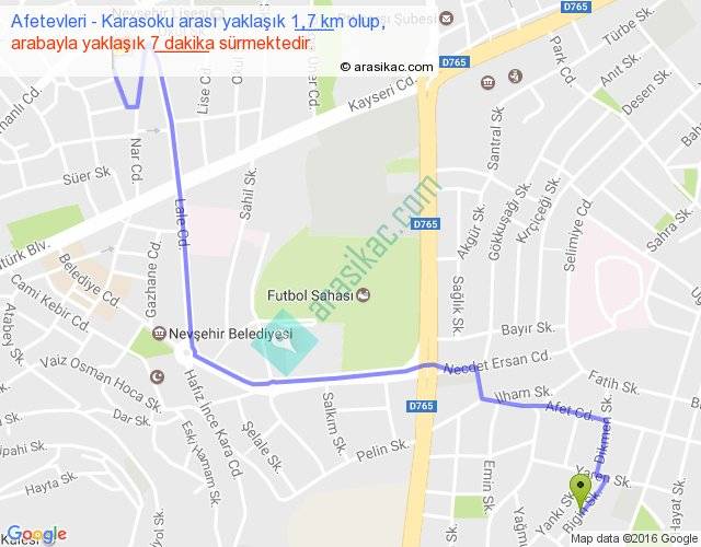 Afetevleri - Karasoku arası yaklaşık olarak 90 km/h ile yukarıda belirtilen sürede olup, iki yerin kuş uçuşu uzaklığı (mesafesi) 1'dir. Yolculuk otobüsle 9 dakika sürmektedir.