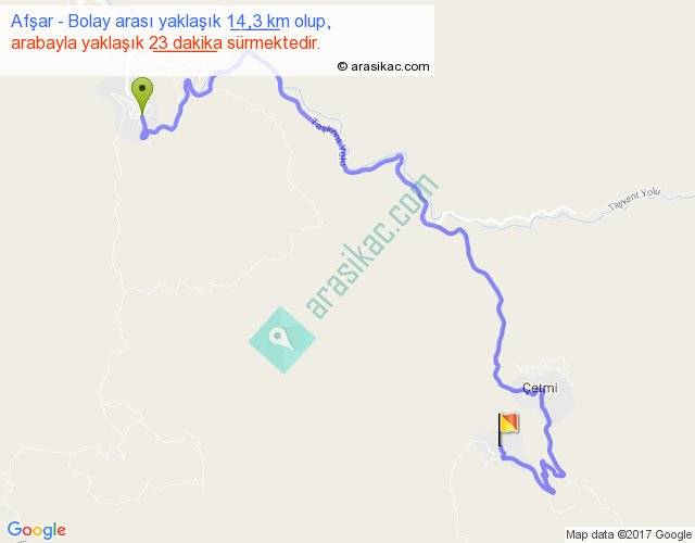 Afşar - Bolay arası yaklaşık olarak 90 km/h ile yukarıda belirtilen sürede olup, iki yerin kuş uçuşu uzaklığı (mesafesi) 7'dir. Yolculuk otobüsle 29 dakika sürmektedir.