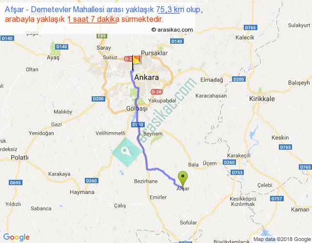 Afşar - Demetevler Mahallesi arası yaklaşık olarak 90 km/h ile yukarıda belirtilen sürede olup, iki yerin kuş uçuşu uzaklığı (mesafesi) 62'dir. Yolculuk otobüsle 1 saat 27 dakika sürmektedir.