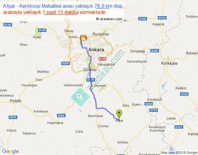 Afşar - Kentkoop Mahallesi arası yaklaşık olarak 90 km/h ile yukarıda belirtilen sürede olup, iki yerin kuş uçuşu uzaklığı (mesafesi) 64'dir. Yolculuk otobüsle 1 saat 34 dakika sürmektedir.