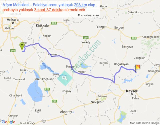 Afşar Mahallesi - Felahiye arası yaklaşık olarak 90 km/h ile yukarıda belirtilen sürede olup, iki yerin kuş uçuşu uzaklığı (mesafesi) 218'dir. Yolculuk otobüsle 4 saat 42 dakika sürmektedir.
