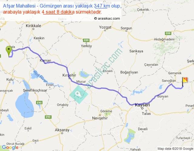 Afşar Mahallesi - Gömürgen arası yaklaşık olarak 90 km/h ile yukarıda belirtilen sürede olup, iki yerin kuş uçuşu uzaklığı (mesafesi) 274'dir. Eğer belirtilen yerler arasında uçak seferi var ise bu süre uçakla 25 dakika'ya kadar düşebilir. Yolculuk otobüsle 5 saat 22 dakika sürmektedir.