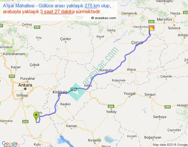 Afşar Mahallesi - Güllüce arası yaklaşık olarak 90 km/h ile yukarıda belirtilen sürede olup, iki yerin kuş uçuşu uzaklığı (mesafesi) 227'dir. Yolculuk otobüsle 4 saat 29 dakika sürmektedir.