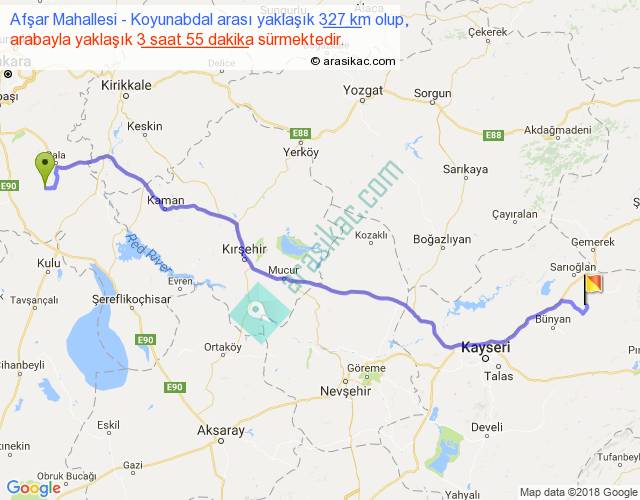 Afşar Mahallesi - Koyunabdal arası yaklaşık olarak 90 km/h ile yukarıda belirtilen sürede olup, iki yerin kuş uçuşu uzaklığı (mesafesi) 260'dir. Eğer belirtilen yerler arasında uçak seferi var ise bu süre uçakla 24 dakika'ya kadar düşebilir. Yolculuk otobüsle 5 saat 5 dakika sürmektedir.