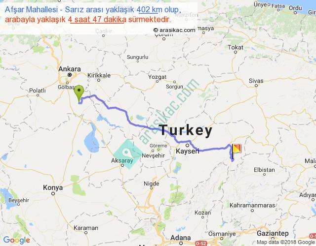 Afşar Mahallesi - Sarız arası yaklaşık olarak 90 km/h ile yukarıda belirtilen sürede olup, iki yerin kuş uçuşu uzaklığı (mesafesi) 314'dir. Eğer belirtilen yerler arasında uçak seferi var ise bu süre uçakla 28 dakika'ya kadar düşebilir. Yolculuk otobüsle 6 saat 13 dakika sürmektedir.