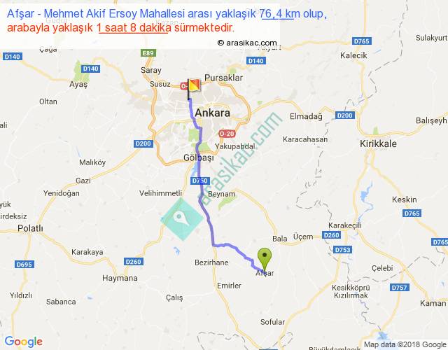 Afşar - Mehmet Akif Ersoy Mahallesi arası yaklaşık olarak 90 km/h ile yukarıda belirtilen sürede olup, iki yerin kuş uçuşu uzaklığı (mesafesi) 63'dir. Yolculuk otobüsle 1 saat 28 dakika sürmektedir.