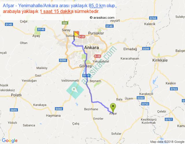 Afşar - Yenimahalle Ankara arası yaklaşık olarak 90 km/h ile yukarıda belirtilen sürede olup, iki yerin kuş uçuşu uzaklığı (mesafesi) 67'dir. Yolculuk otobüsle 1 saat 37 dakika sürmektedir.