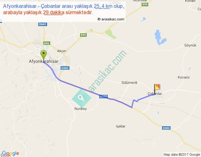 Afyonkarahisar - Çobanlar arası yaklaşık olarak 90 km/h ile yukarıda belirtilen sürede olup, iki yerin kuş uçuşu uzaklığı (mesafesi) 22'dir. Yolculuk otobüsle 36 dakika sürmektedir.