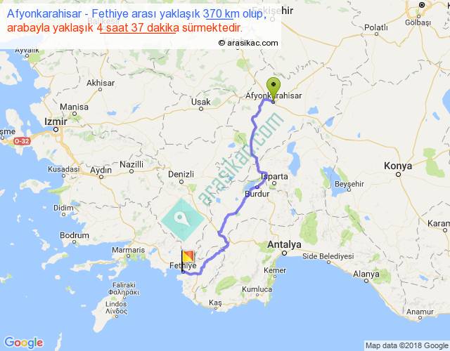 Afyonkarahisar - Fethiye arası yaklaşık olarak 90 km/h ile yukarıda belirtilen sürede olup, iki yerin kuş uçuşu uzaklığı (mesafesi) 263'dir. Eğer belirtilen yerler arasında uçak seferi var ise bu süre uçakla 24 dakika'ya kadar düşebilir. Yolculuk otobüsle 5 saat 48 dakika sürmektedir.