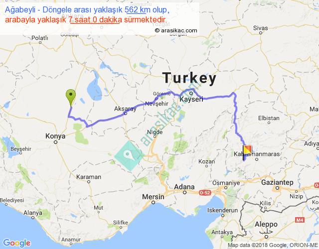 Ağabeyli - Döngele arası yaklaşık olarak 90 km/h ile yukarıda belirtilen sürede olup, iki yerin kuş uçuşu uzaklığı (mesafesi) 347'dir. Eğer belirtilen yerler arasında uçak seferi var ise bu süre uçakla 32 dakika'ya kadar düşebilir. Yolculuk otobüsle 9 saat 6 dakika sürmektedir.