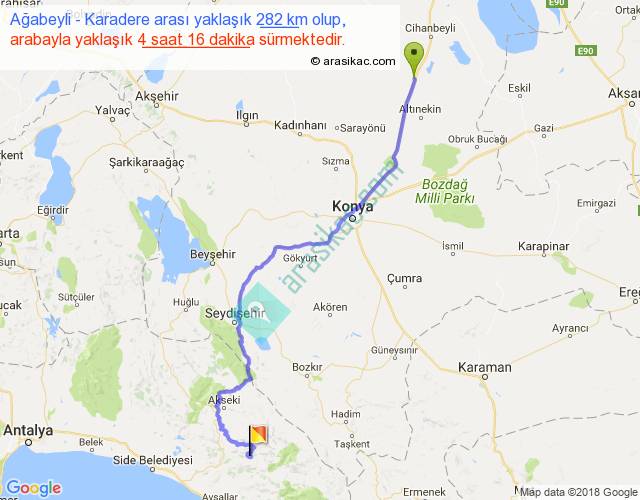 Ağabeyli - Karadere arası yaklaşık olarak 90 km/h ile yukarıda belirtilen sürede olup, iki yerin kuş uçuşu uzaklığı (mesafesi) 198'dir. Yolculuk otobüsle 5 saat 32 dakika sürmektedir.