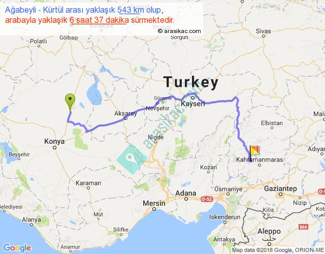 Ağabeyli - Kürtül arası yaklaşık olarak 90 km/h ile yukarıda belirtilen sürede olup, iki yerin kuş uçuşu uzaklığı (mesafesi) 353'dir. Eğer belirtilen yerler arasında uçak seferi var ise bu süre uçakla 32 dakika'ya kadar düşebilir. Yolculuk otobüsle 8 saat 36 dakika sürmektedir.